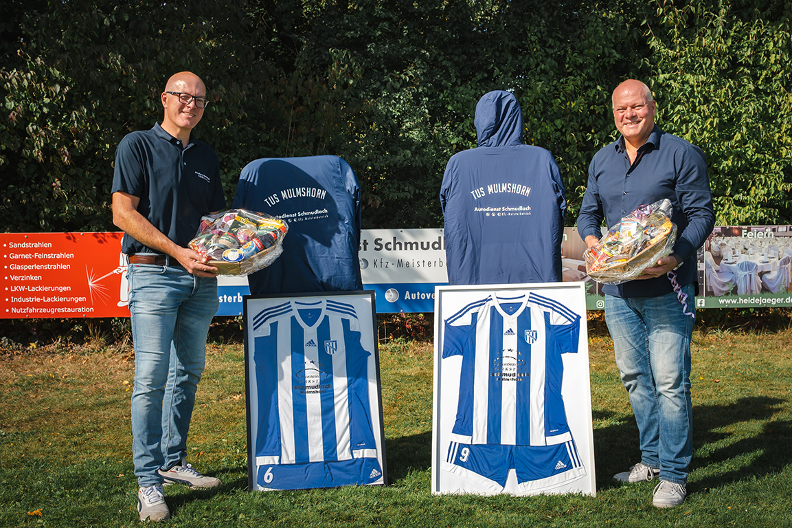 Der @tus_mulmshorn bedankte sich mit Präsentkörben bei Norbert und Kim Schmudlach sowie mit einer ganz besonderen Geste: Die mit dem Verein eng verbundenen Brüder bekamen jeweils ein gerahmtes Trikot mit ehemaliger Rückennummer aus aktiven Zeiten. Die Trikots stammen aus einem Satz, der ausgemustert wurde – mit Schmudlach als Sponsoren-Logo auf der Brust.